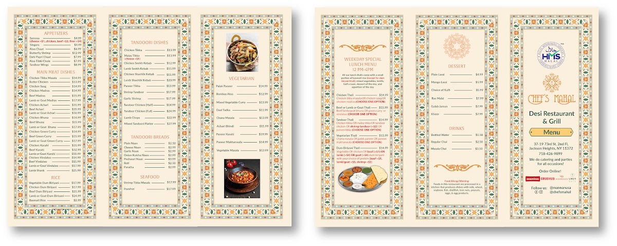 If you're in the mood for authentic, flavorful Indian cuisine, look no further than Chef's Mahal-Desi Restaurant & Grill Menu. Located in the heart of Jackson Heights, NY, this restaurant brings the rich, aromatic spices of India to your table. From tender kebabs and tandoori dishes to creamy curries and biryanis, each dish is crafted with fresh ingredients and traditional techniques. Whether you're craving a quick bite or a hearty meal, the menu offers a variety of options to suit every taste. Pair your meal with a refreshing lassi or an Indian-inspired dessert to round off the experience. Chef’s Mahal ensures a delightful dining experience that transports you straight to the vibrant streets of India with every bite.